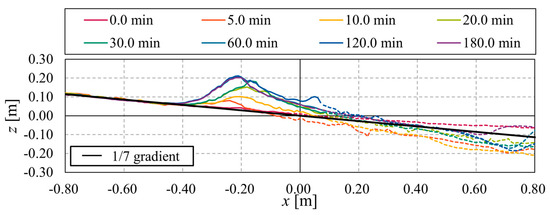 Figure 9 shows that at = 0.0 min (initial topography), for > 0, the dashed line indicates the water surface, which complicates the accurate reproduction of the topography. Meanwhile, for < 0, the solid line shows the topography where the water surface does not affect measurements, the 1/7 gradient is accurately reproduced, indicating high reproducibility for landforms not in contact with the water. The figure shows that gravel accumulation began around = −0.20 m from = 5.0 min by = 10.0 min, and this accumulation had increased to a height of = 0.10 m above the initial topographic elevation of the shoreline, forming berm. The formation of the berm likely prevented the water surface’s influence from extending further landward. This can be seen from the fact that the solid and dashed boundaries that mark the boundary between land and water are not located landward of the top of the berm.