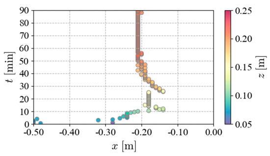 Figure 10 shows the location of the maximum height at the center of the channel ( = 0.00 m) and its variation with height over time. The figure reveals that sedimentation continued to progress until = 60.0 min, stabilizing at approximately = 0.20 m with = −0.20 m at the peak.
