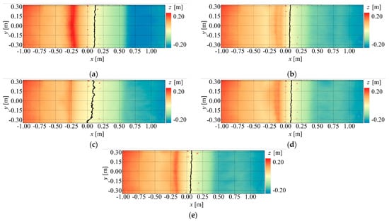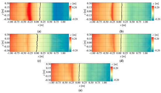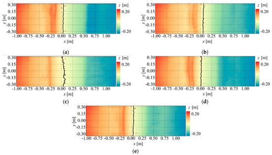 The DSM of the final topography without the countermeasure is shown in Figure 11. In the figure, the berm at = 0.00 m is marked with a black line. This figure reveals that, without the countermeasure, the shoreline position after the topography has equilibrated varies with the wave conditions. In all cases, the waves propagated further offshore than before wave formation. The location of berm formation, which occurs near = −0.25 m, does not depend on the magnitude of . As shown in Cases 1 and 2 (Figure 11a,b), a smaller ratio results in a higher berm elevation and a tendency for the shoreline position to advance further offshore. These observations confirm that the shoreline position, berm elevation, and berm location are influenced by the ratio.