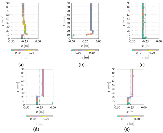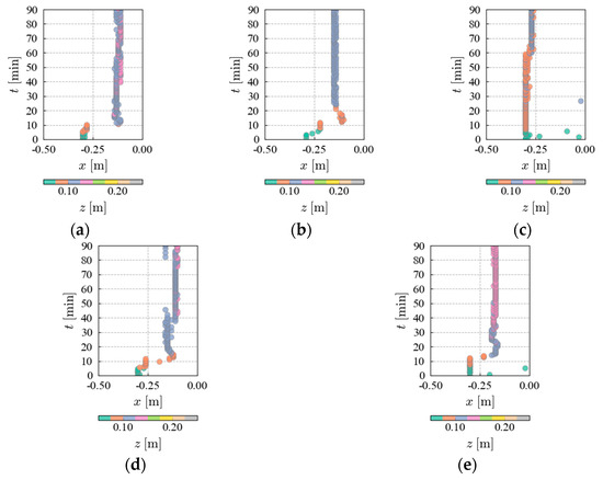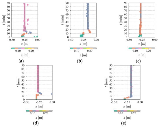 Figure 13 shows the time-series variation in the maximum elevation from the shoreline to the shore (−0.50 m < < 0.00 m). The highest elevation at = −0.50 m is observed immediately after the start of wave generation owing to the constant slope. The figure indicates that the position of maximum elevation shifts over time as gravel accumulates from run-up waves. In all cases except Case 3-1, the location of the maximum elevation advances from the shore side to the offshore side by = 20.0 min. The process of landform change varies with the magnitude of : in Cases 1-1 and 2-1, the position of maximum elevation retreats toward the shore side, while in Cases 4-1 and 5-1, it remains in a fixed position. In Case 3-1, there is no change in the position of maximum elevation from the beginning to the end of wave-making.