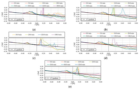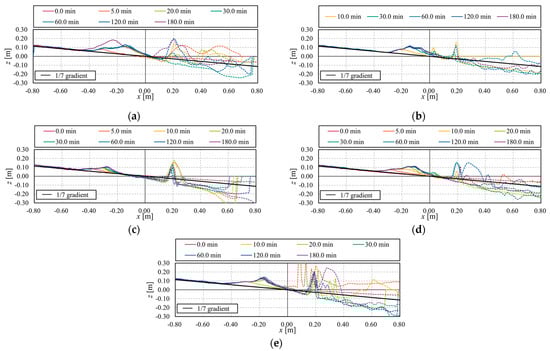 Change in topography of cross-section over time ( = 20 cm): (a) Case 1-3; (b) Case 2-3; (c) Case 3-3; (d) Case 4-3; (e) Case 5-3.
