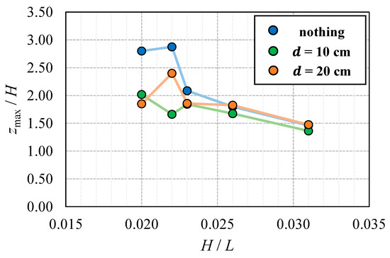 From the DSM of the final topography, the maximum elevation () of the central cross-section of the channel was extracted and made dimensionless by wave heights for each wave condition. Figure 20 compares the relationship between and the dimensionless maximum elevation of the berm with and without the countermeasure and by the distance of placement.
