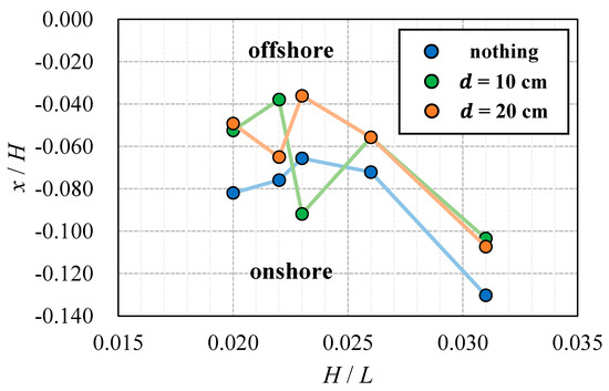 From the DSM of the final topography, the maximum elevation position () of the central cross-section of the channel was extracted and made dimensionless by wavelength for each wave condition. Figure 21 compares the relationship between and the dimensionless maximum elevation position of the berm () with and without the countermeasure and by the distance of the pile-row arrangement.
