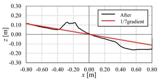 Figure 17 shows the DSM of the final topography with staggered piles when the distance between rows B and S is increased to 20 cm in the offshore direction. The shoreline at = 0.00 m in the final topography is marked with a black line, as in the case without the countermeasure.