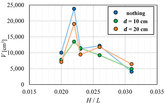 Figure 23 reveals that under wave conditions where is less than 0.026, the installation of the staggered piles effectively reduces the amount of sedimentation in the land area to levels equal to or lower than those observed in scenarios without the countermeasure. Notably, under the wave condition of = 0.022, Figure 11a indicates that the landform change without countermeasure is significant, leading to considerable gravel deposition in the land area. Under conditions with extensive landform change, such as berm formation, the staggered piles significantly inhibit gravel run-up. Meanwhile, under wave conditions with an of 0.031, the amount of sedimentation in the land area increased compared to cases without the countermeasure, regardless of the pile-row installation interval. The larger the value, the smaller the amount of gravel transported by breaking waves. Therefore, the gravel transported by upwelling waves can easily pass through plies. The staggered piles reduced the flow volume and increased the velocity of the gravel passing through piles, which resulted in the gravel being transported further to the shore side.