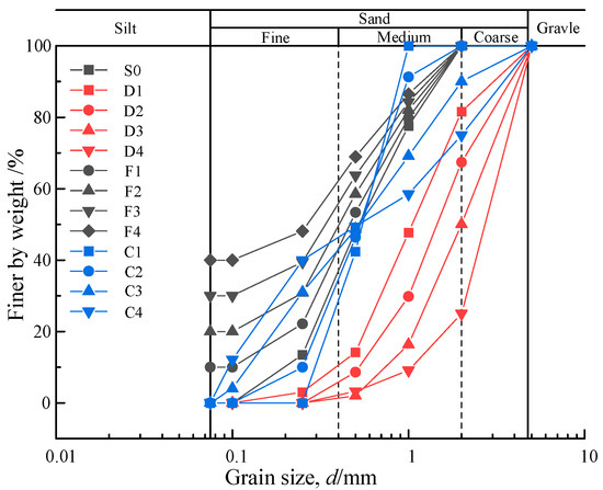 The gradation of soil has a very significant impact on its mechanical behavior [6,7]. In actual engineering sites, there are various gradations of coral sand distributed. The impact of gradation on the mechanical behavior of coral sand is a current research hotspot [8]. At present, it is generally believed that the inhomogeneity coefficient (Cu), average particle size (d50), and fines content (Fc) are the three basic physical quantities that characterize particle gradation, which are important factors affecting the properties of particle materials. Chen et al. [9] found that the softening and swelling of coral sand with smaller average particle size were more significant during the shearing process under low confining pressure. The particle size distribution of the “hyperbola” or “linear” curves tends to change to an “S-shaped” type after shearing, and the change is affected by confining pressure and initial gradation. The relative breakage rate of coral sand particles increased with the increase in confining pressure and average particle size. According to the results of the triaxial compression test, an expression related to the confining pressure and gradation parameters of relative failure is proposed. Guo et al. [10] conducted a series of triaxial tests on gravel with two groups of gradations, and the results showed that the liquefaction resistance of the samples increased with the increase in the average particle size under the same inhomogeneity coefficient. However, the inhomogeneity coefficient at the same average particle size does not affect the undrained cycling behavior of the gravel, and the resulting pore water pressure is uniform when the sample is subjected to the same cyclic load. Chakrabortty et al. [11] conducted strain-controlled cyclic triaxial tests on three types of soils, natural sand, medium sand, and fine sand, and found that the development rate of ultra-static pore water pressure in fine sand was much greater than that of medium sand, which ultimately led to the liquefaction resistance of fine sand being lower than that of medium sand. Karim et al. [12] showed that when the relative density was constant, the liquefaction resistance of the saturated coarse–fine-grained mixture decreased first and then increased slightly with the increase in fines content. Liang et al. [13] studied the effects of inhomogeneity, average particle size, and fines content on the maximum dynamic shear modulus by resonance column test, and the maximum dynamic shear modulus of coral sand was significantly affected by its particle size distribution and particle shape. Zuo et al. [14] and Wu et al. [15] have studied the effect of fines content on the dynamic shear modulus of saturated sand and found that the dynamic shear modulus gradually decreases as the fines content increases to 30%, and have proposed prediction models for the dynamic shear modulus based on different methods.