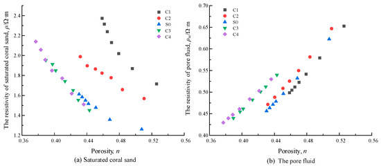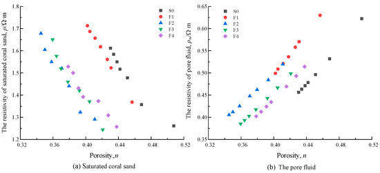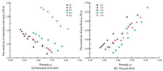 - There is no effect on the development mode of the resistivity of saturated coral sand with porosity. The resistivity of saturated coral sand increases with the decrease in porosity, and the greater the amplitude of the porosity reduction in the sample, and the greater the amplitude of the corresponding resistivity increase.