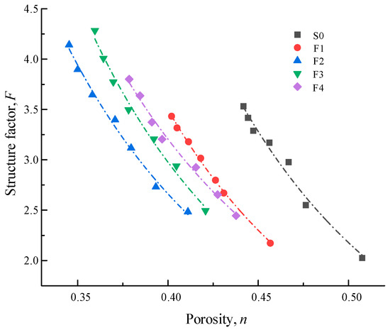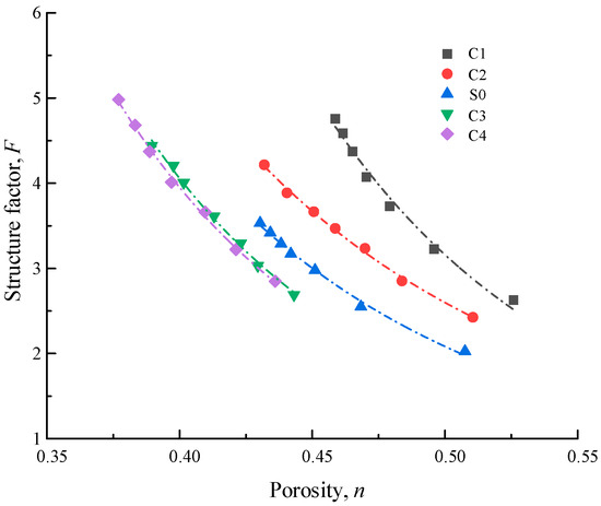 In order to eliminate the influence of porosity resistivity, Figure 6 shows the experimental results of the change in structure factor F with porosity n under different average particle sizes d50. In the case of the same n, the larger the d50, the greater the F of the saturated coral sand. This is because the increase of d50 increases the contact area between particles and particles, and the contact area between particles and water molecules decreases; the less close the connection between the pores, the fewer the pore water channels are connected, and the more difficult the current to pass through, resulting in the higher the resistivity, the more difficult it is to conduct electricity. It can also be seen that the relationship between the structure factor and porosity of saturated coral sand under different average particle sizes is a power function, and the fitting results are shown in Table 3.