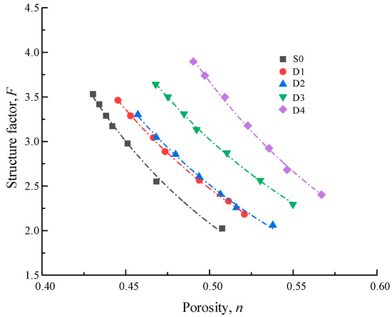 Through the analysis of the above influencing factors, it can be seen that the structural factors F of saturated coral sand of different gradations are related as a power function, and the empirical formula is [12,20,27]:
