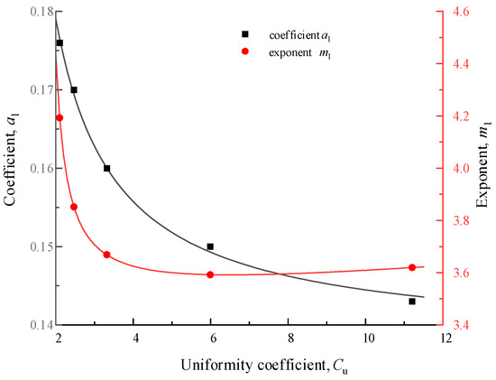Figure 9 shows the relationship between the coefficient a1, the exponent m1, and the inhomogeneity coefficient Cu, and it can be seen that a1 decreases with the increase of Cu, and the rate of decrease gradually slows down. m1 decreases with the increase of Cu, and the rate of decrease gradually slows down until Cu rises slightly. The best-fit expressions for a1 and m1 are: