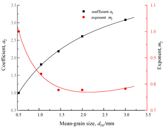 In order to eliminate the influence of Cu, the fitted a and m obtained in Table 3 were normalized to a1 and m1, respectively, and the relationship between a2 (a/a1) and m2 (m/m1) and d50 was obtained, as shown in Figure 10, it can be seen that a2 increases with the increase of d50, m2 decreases linearly with the increase of d50, and the best fitting expressions for a2 and m2 are: