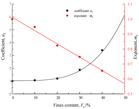 In order to eliminate the effects of Cu and d50, the fitted a and m obtained in Table 4 were normalized to a1 × a2 and m1 × m2, respectively, and a3 (a/a1/a2) and m3 (m/m1/m2) were obtained with Fc, as shown in Figure 11, it can be found that with the increase in Fc, a3 gradually increases, and m3 decreases linearly. The best-fitting expression for numbers a3 and m3 is: