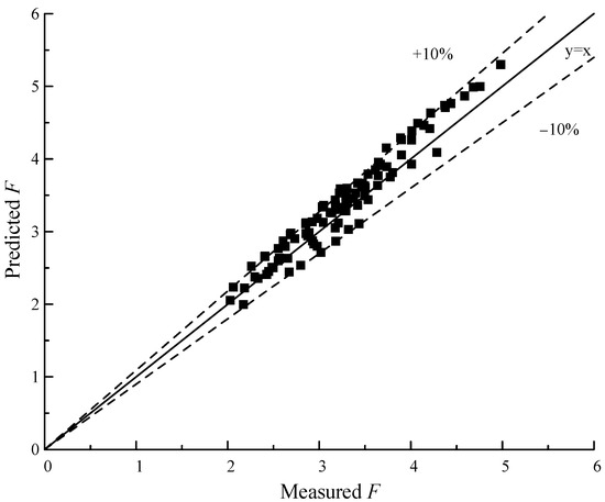 Through the above parameter-correlation analysis, the prediction model of the binding factor F of saturated coral sand under different gradations can be obtained. Figure 12 shows a comparison between the predicted and experimental values of the saturated coral sand structure factor F obtained based on the prediction model. It can be found that the relative error of F’s prediction model is not more than 10%, the scatters are evenly distributed on both sides of the 45º line, and the prediction effect is better.