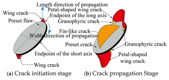 The wing cracks initiated at the tips of the preset 3D flaw (the endpoint of the long axis), and the initiation direction was approximately perpendicular to the preset flaw surface. With an increase in the load, in the length direction, the wing crack gradually turned to the direction of the maximum principal stress; in the width direction, the wing crack propagated along the edge of the preset flaw, forming a petal-shaped wing crack. When the propagation of the petal-shaped wing crack was close to reaching the end point of the short-axis, the wrapped wing crack was formed.