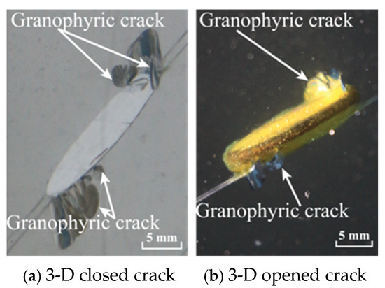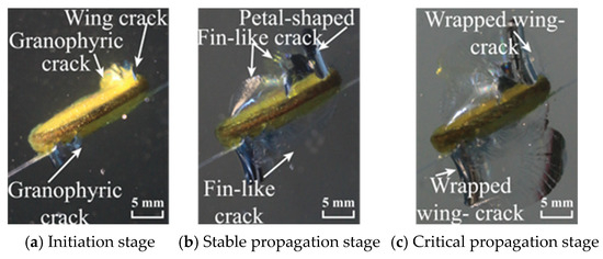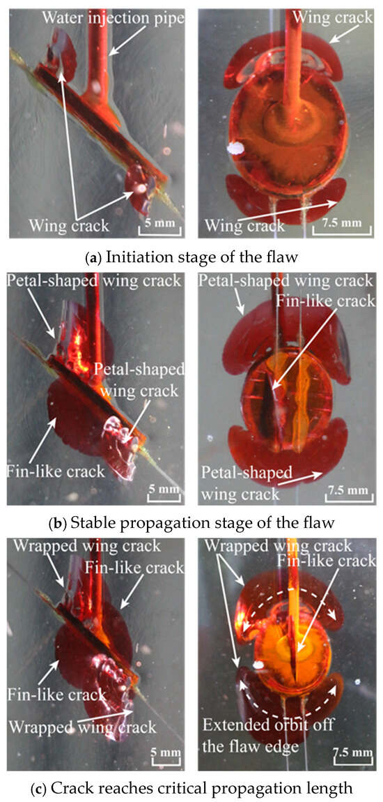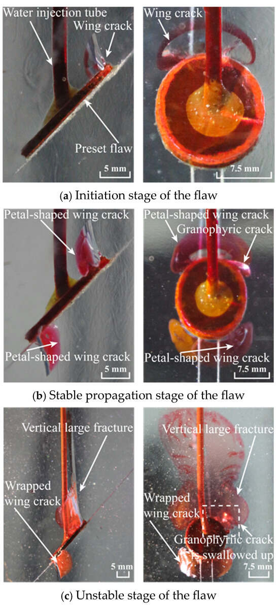 Firstly, the fracture test under no-water conditions was carried out. Under the axial loads, the initiation and propagation modes of the 3D hollow flaw had similarities with the closed flaw, which was described in the literature [44] (Figure 3). The wing cracks initiated at the tips of the flaw. With an increase in the load, the wing crack gradually grew into a petal wing crack. During this period, the granophyric crack kept initiating and was merged with the wing crack, forming wrapped wing cracks.