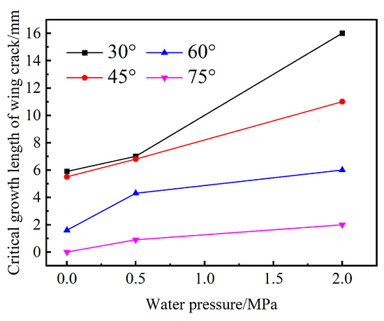 Furthermore, the water pressure had an obvious promoting effect on the crack initiation and propagation. Under the conditions of no water and low water pressure, the formation of the wing crack was relatively slow. The process of wing crack initiation and propagation gradually accelerated with an increase in water pressure. When the water pressure increased to 4 MPa, the propagation of the wing crack was almost instantly completed. In addition, the increase in water pressure enhanced the propagation degree of the wing cracks, so that its critical propagation length increased continuously, as shown in Figure 7. Taking the 30° dip angle flaw as an example (Figure 8). When the water pressure increased from 0 MPa to 2 MPa, the critical propagation length of the wing crack grew from 0.58a to 1.58a (a is the length of the long axis of the preset crack). When the water pressure rose to 4 MPa, the wing crack continued to propagate, resulting in specimen splitting and failure. At this time, the critical propagation length did not exist. Under the condition of no water or low water pressure, the ‘self-limiting’ effect made the critical propagation length of the wing crack exist [47,48]. The increase in water pressure exacerbated the normal dilatation effect at the leading edge of the wing crack propagation, which promoted the occurrence of crack at the leading edge of the propagation and effectively overcame the ‘self-limiting’ effect [38], and increased the critical propagation length.
