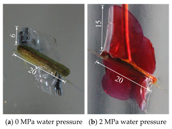 Secondly, the increase in water pressure delayed the initiation timing of the fin-like crack. Under the condition of no water or low water pressure, the fin-like cracks initiated rapidly on the upper and lower surfaces of the flaw. However, with the increase in the water pressure, the initiation timing was delayed. When the water pressure increased to 4 MPa, the fin-like cracks basically no longer initiated (Figure 5). It was analyzed that the water pressure in the crack partially offset the load borne by the surface of the hollow flaw and reduced the deflection deformation and tensile stress concentration on the upper and lower surfaces, which increased the axial load required for the initiation of the fin-like cracks.
