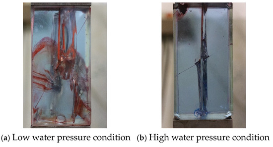 Finally, the water pressure had a significant effect on the final damage mode of the specimens. The damage modes of specimens corresponding to high and low water pressures are shown in Figure 9. Under the condition of no water or low water pressure, the wing crack stopped propagating after reaching the critical propagation length and when the external load increased to the ultimate bearing capacity of the material. A macroscopic rupture surface was generated inside the specimen, which lapped and passed through the wing and fin cracks, leading to the overall rupture of the specimen. Under high hydro-mechanical coupling, the wing cracks continued to propagate and penetrated into the surface of the specimen, forming a vertical large rupture surface, which led to the crack failure of the specimen.