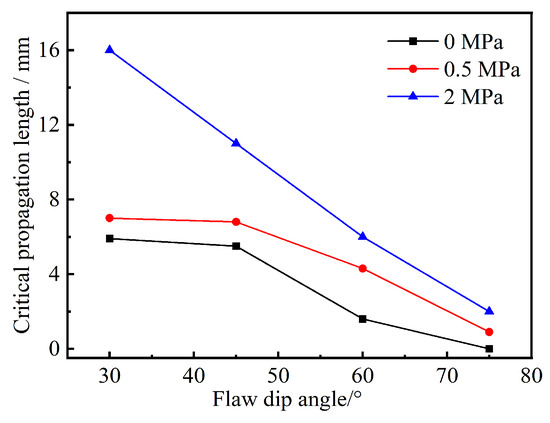 The influence of the flaw dip angle on the critical propagation length of wing cracks is shown in Figure 10. With the increase in the flaw dip angle, the critical propagation length of the wing crack decreased gradually. Taking the condition of 0.5 MPa water pressure as an example (Figure 11), when the flaw dip angle was 30°, the critical propagation length of the wing crack was about 0.70a (a is the length of the long semi-axis of the preset flaw), which was slightly larger than that of the 45° flaw, which was about 0.68a. When the flaw dip angle increased to 60°, the critical propagation length of the wing crack decreased to 0.42a. Moreover, the wing crack stopped propagating after the emergence of cracks at an angle of 75°. With an increase in the flaw dip angle, the crack initiation direction of the wing crack was gradually inclined horizontally. And the ‘self-limiting’ effect of the surrounding material on the propagation of the wing crack was strengthened under the action of the axial load, and the critical propagation length of the wing crack gradually decreased.