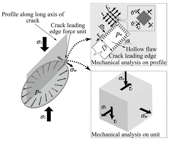 The analysis suggested that the emergence of the wing crack at the leading edge of the flaw under hydro-mechanical coupling was mainly caused by the combination of tension and shear stresses. As shown in Figure 13, the axial compressive load σ1 could be decomposed into the normal stress σn and the shear stress τ on the flaw surface. The σn made the hollow flaw extruded and deformed, which led to the shear force fs at the crack leading edge, while the shear stress τ prompted the upper and lowered surfaces of the crack to misalign with each other, which generated the tensile force t at the crack leading edge. The water pressure pw produced an expansive effect on the top and bottom surfaces and the side of the flaw, which weakened the compressive effect of the axial load on the flaw surface and caused tensile stress σm at the tips of the flaw.