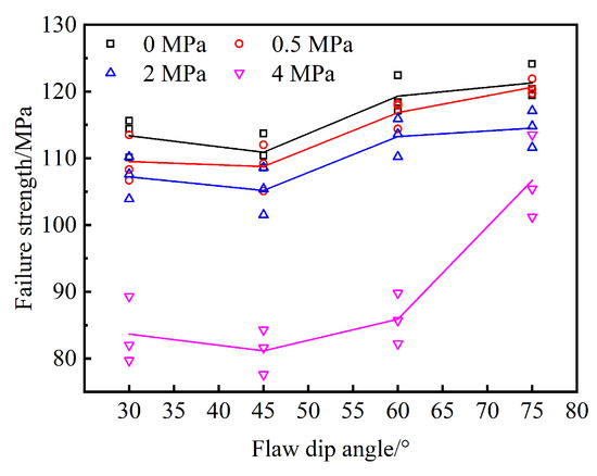 As shown in Figure 16, the influence of the flaw dip angle on the failure strength of the specimen was similar to that of the crack initiation stress. Under each water pressure condition, the failure strength of the specimens showed a tendency of decreasing first and then increasing with an increase in the flaw dip angle. Among them, the strength of the specimen with 45° flaw was the lowest, and the strength of the specimen with the 75° flaw was the highest.