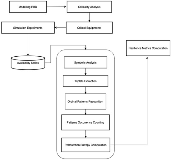 The methodology is based on a conventional RAM analysis [22]. Initially, the system is modeled using the RBD (Reliability Block Diagram) [23]. Once information about the main reliability and maintainability parameters is collected, the probability distribution functions that explain the failure and reliability processes of each piece of equipment are defined. Based on this information, the critical components of the system are determined. This effort is made to prioritize the equipment from which the RAM analysis will be developed [24]. With the results of the RAM analysis, a time series will be defined, that is, a time series of the system’s availability. This analysis will allow experiments that sensitize the behavior of systemic resilience, based on modifications in preventive maintenance strategies in critical equipment or other equipment belonging to the system. Finally, it will be possible to know how resilience reacts based on hypothetical but feasible scenarios according to these assumptions. In the next section, we describe the procedure for calculating resilience based on a time series with values of the system’s availability.