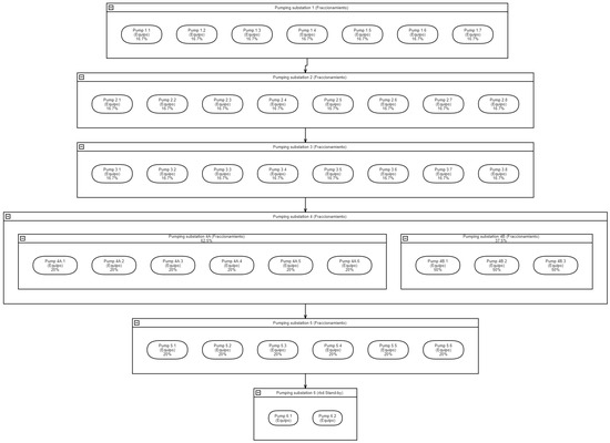 The analysis includes a flowchart detailing assets and describes a seawater impulsion with a nominal capacity of 180 m3/h. Figure 2 shows a simplified flow diagram of the facility. The figure represents a structure of the pumping system comprising multiple subsystems and individual pumps. The system is a modular design structured into distinct subsystems with well-defined taxonomical dependencies, ensuring a clear and logical flow of operations. To enhance reliability and operational resilience, the system incorporates redundant and standby components, ensuring continuous functionality even in the event of equipment failure. Pumps and subsystems work collaboratively to support various critical stages of operation, thereby optimizing performance and ensuring robust system integrity.
