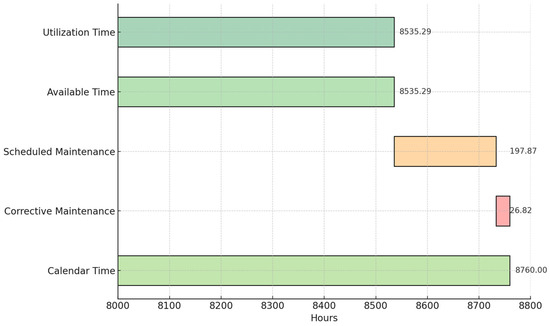 Although the objective of this work is not to analyze the significance of a 1% increase in system availability but rather to demonstrate the feasibility and ease of applying a resilience indicator that responds to changes in maintenance performance in critical equipment, we can state that a 1% increase in systemic availability in a facility designed for continuous operation can be considered a significant achievement. Furthermore, if we add to this the fact that, in the simulated scenario, this increase is linked to an enhancement and alignment of the time between interventions (100 h)—along with the associated optimization of preventive intervention costs—it can be asserted that, for a plant of this type, the results should be regarded as highly significant.