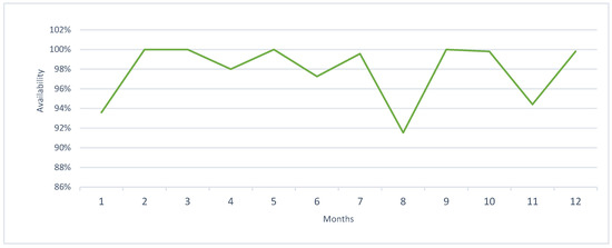 It can be observed that the substation with the lowest availability value is Substation 3. Figure 4 illustrates the availability performance of pumping substation #3. In Figure 5, the Jackknife [30] diagram is presented, showing the reliability and maintainability behavior of all pumps within substation 3.