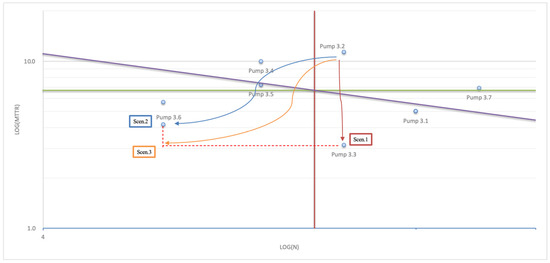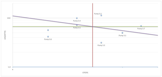 Table 3 presents the MTTR values and the number (N) of unplanned downtime events for each pump in substation 3. The greatest deviation is observed in pump 3.2, which is in the acute-chronic quadrant of the diagram. This indicates that the pump simultaneously exhibits poor performance in terms of both failure frequency and mean time to repair (MTTR).