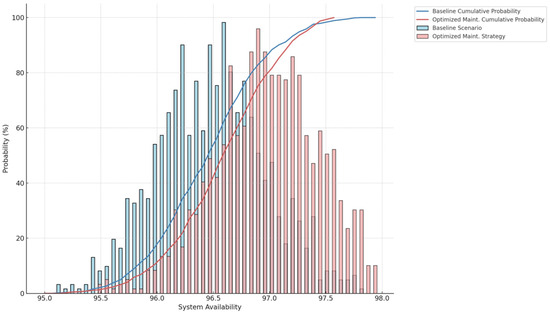 An additional analysis was conducted by modifying (optimizing) the maintenance plan for the pumps, adjusting the schedule to include a preventive intervention every 100 h (simulated scenario #4). Once the RAM experiments were performed, with this new strategy, the availability data obtained were presented in Table 7. Additionally, histograms of the simulations for the baseline case and the availability performance under the new 100-h strategy are shown in Figure 7.