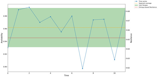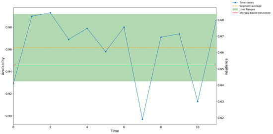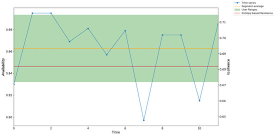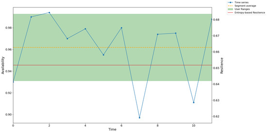 The proposed approach introduces a resilience indicator derived from time series containing data on the system’s availability. The method begins with a symbolic analysis of this series, where its values are discretized and transformed into symbols [25]. This transformation into symbols is done by classifying the system’s availability data into value ranges (for example, high, medium, low) using user-defined limits or acceptance ranges. Subsequently, these symbols, grouped into triplets, constitute the so-called ordinal patterns [26]. Through these patterns, changes in the system’s behavior are represented. The patterns are analyzed based on an approach focused on transitions between availability states, such as drops and/or recoveries. Certain patterns are identified and weighted more intensely with the concept of resilience, assigning greater weight to patterns indicating stability or rapid recovery compared to those representing significant drops in availability or slow recoveries, thus better evaluating the measure of resilience. Once the occurrences of these patterns are counted, the modified permutation entropy method is applied to these patterns to assess the system’s resilience. After the ordinal patterns have been identified and counted, the permutation entropy calculation method and the resilience indicator are computed.