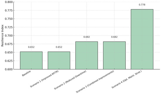 As observed, the systemic availability obtained through the simulation yields an average value of 97.41%. Compared to the baseline value, this represents an improvement of over 1% in plant availability. The following section analyzes the effects of all scenarios on the system’s resilience value.