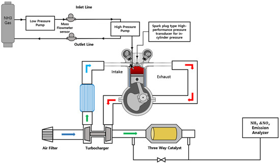 Ammonia may initially appear unsuitable as engine fuel because of its high self-ignition temperature. However, its stoichiometric air–fuel ratio is 6.045, which is lower than that of other fuels. As a result, the calorific value of the fuel–air mixture is comparable to or higher than that of conventional fuels, such as gasoline and diesel. This means that even with current mass-produced engines, a reduced air intake can still generate a power output equivalent to or greater than that of traditional fuels. As the octane number is high (over 130), it is suitable for the development and operation of engines with an ignition source through a spark plug, such as a gasoline engine [11]. Previous studies have reported that it is possible to develop an engine using only pure ammonia fuel using an existing electric ignition engine or a diesel-engine-based high-compression-ratio engine. However, the development of successful engines has been limited by difficulties in configuring their intake and fuel supply systems [12,13]. In particular, for a stable supply of gaseous fuel to the intake manifold, the supply pressure can be maintained only by maintaining the temperature of the fuel container where liquid ammonia vaporizes. The Chinese company Guangzhou Automobile Group (GAC), a long-term partner of Toyota, unveiled an innovative internal combustion engine powered by ammonia during Tech Day, the annual technology event of the company, in summer 2024. The GAC prototype is a 2-L four-cylinder ammonia engine with an output of 161 HP that does not use forced induction and has 90% lower carbon emissions than a fossil fuel engine with the same capacity and output [14]. Wärtsilä in Finland announced in July 2021 that it had successfully tested a 70% ammonia co-fired engine at a typical ship propulsion load and planned to complete the development of a four-stroke ammonia full-fired medium-sized engine by 2023 [7].