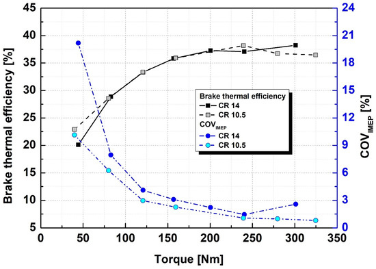 First, the results of the improvement in the brake thermal efficiency (BTE) and combustion stability were examined as the compression ratio increased at an engine speed of 1000 rpm. As shown in Figure 2, as the compression ratio increased, the operating range was reduced to a condition where the maximum torque was 301.1 Nm, a decrease of approximately 7.8% compared with the existing compression ratio condition. The BTE increased up to the 200 Nm load condition and converged to approximately 37% at higher load conditions. The decrease in the BTE under load conditions of 200 Nm or less can be considered as the effect of pumping loss owing to a decrease in the intake pressure. Regardless of the compression ratio, at loads below 100 Nm, the variation in the COVIMEP exceeded 5%, indicating inconsistent combustion behavior and contributing to a rapid decrease in BTE. However, combustion stability deteriorated as the compression ratio increased under all torque conditions. The BTE was at a similar level under all operating conditions, except for the lowest load operating condition, where there was a large difference in combustion stability, which showed a different trend from the expected improvement in the BTE as the compression ratio increased. In the case of the lowest load operating condition, the combustion stability deteriorated under the high-compression-ratio condition, and the BTE decreased slightly compared to the existing compression ratio condition.