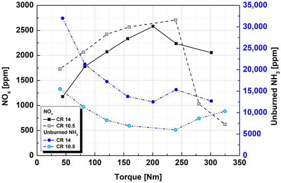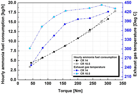 Accordingly, the results of the supplied fuel flow rate were examined, which directly affected the BTE under constant-torque conditions. Figure 3 shows the results of the ammonia fuel supply flow rate and exhaust gas temperature according to the load under the same operating conditions as shown in Figure 2. The flow rate of ammonia supplied to satisfy the load conditions was almost the same, regardless of the compression ratio. However, under an increased compression ratio, the exhaust gas temperature decreased significantly, showing a difference of over 65 °C at a load condition of 80 Nm, and the temperature difference decreased as the load condition increased. This result shows that under high-compression-ratio conditions, the rate at which part of the input energy is lost owing to a decrease in the exhaust gas temperature decreases.