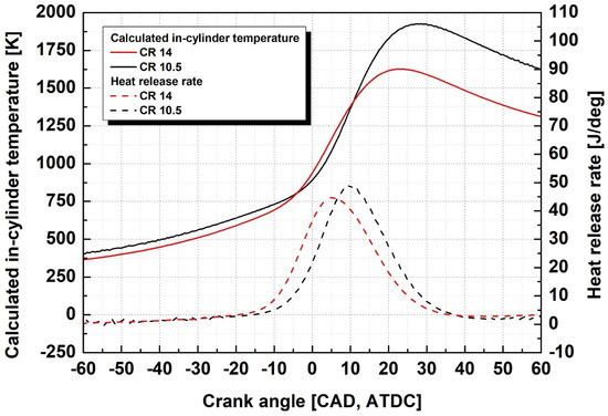 The calculated in-cylinder temperature and heat release rate for compression ratios of 10.5 and 14 were compared under a load of 120 Nm. As shown in Figure 5, the peak in-cylinder temperature calculated from the in-cylinder pressure was lower with an increased compression ratio. At the same ignition timing, when the compression ratio was increased, ignition occurred faster, but the peak heat release rate was lower than the trace of the heat release rate. The reason for this phenomenon is believed to be that the ammonia fuel injection timing of the high-pressure direct injection method occurred before top dead center (BTDC) at a 360° crank angle degree (CAD), and the location of the piston used to increase the compression ratio was relatively close to the fire deck of the engine head. As the compression ratio increased from 10.5 to 14, the height of the central part of the upper surface of the piston increased and transformed into a flat shape, reducing the clearance volume. As the fuel injection timing was the same regardless of the compression ratio, a large amount of liquid fuel collided with and wetted the upper surface of the piston under high-compression-ratio conditions, where the piston was closer to the fire deck of the engine head. In the case of ammonia, which has a high latent heat of evaporation, a portion of the fuel injected directly at high pressure in liquid form cannot be fully evaporated until the point of ignition; however, the proportion of fuel droplets that failed to evaporate on the upper surface of the piston appeared to be higher under a high compression ratio. An increase in the thermal efficiency was expected when the compression ratio increased. However, unburned NH3 increased owing to the wetting of ammonia fuel on the top surface of the piston and an increase in droplets rather than an increase in adiabatic compression and temperature owing to an increase in the compression ratio. Consequently, the combustion efficiency decreased, showing a similar level of thermal efficiency to the existing compression ratio conditions.