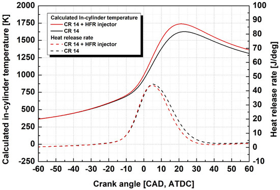 The expected improvement in thermal efficiency and expansion of the operating range were not achieved under an increased compression ratio. The cause of this phenomenon is believed to be that the liquid ammonia fuel that collided and wetted the upper surface of the piston did not evaporate completely until the point of ignition. HFR injectors were used to improve fuel supply characteristics. Figure 6 compares the calculated in-cylinder temperature and heat release rate when applying the HFR injector with those of the existing injector under increased compression ratio conditions. It can be seen from the heat release traces that all other control variables were under the same conditions, and the ignition timing was similar; however, the overall combustion period and heat release amount were reduced. Although the peak heat release rate was similar regardless of the injector type, the peak in-cylinder temperature was higher when the HFR injector was applied. This result shows that the combustion temperature increased because the amount of heat input was smaller, but the proportion of fuel participating in the combustion was higher.