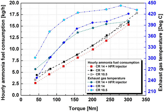 When comparing the ammonia fuel supply flow rate and exhaust gas temperature when the HFR injectors were applied under the same operating conditions, as shown in Figure 7, the flow rate of the fuel supplied with the HFR injectors under similar load conditions was less than that under other conditions. This result indicates that the fuel consumption required to maintain certain operating conditions decreases owing to the increased thermal efficiency. The exhaust gas temperature was also similar to that in the case of a compression ratio of 14, indicating that the proportion of exhaust energy loss was not significantly different when the HFR injector was applied.