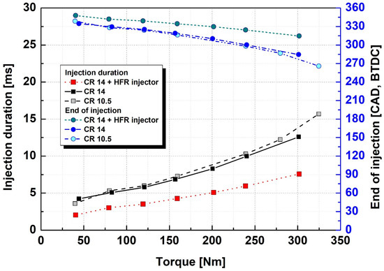 As can be seen from the fuel injection period and the end of fuel injection timing results in Figure 8, the fuel injection period was reduced compared to other conditions depending on the application of the HFR injector. Based on the condition of 300 Nm, which is the longest fuel injection period, the reduction in the injection period of 5 ms was 39.9%, which was a sharp decrease compared to the 3% reduction corresponding to a fuel supply reduction of 0.48 kg/h. As the fuel injection period decreased, the end of the fuel injection timing advanced from BTDC 284 CAD to BTDC 314 CAD. As the piston descended from the TDC, the temperature and pressure in the combustion chamber decreased owing to the expansion. When the end of the fuel injection timing was advanced owing to the application of the HFR injector, the fuel injection ended under relatively high-temperature and high-pressure conditions; therefore, evaporation and mixing of the injected fuel with air were expected to occur more actively than under other conditions.