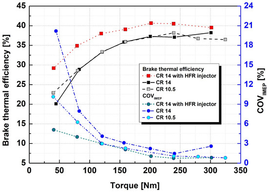 Figure 9 shows the results of comparing the BTE and combustion stability when applying the HFR injector under the same operating conditions as shown in Figure 7. As the flow rate of ammonia supplied under constant load conditions decreased and the proportion of fuel participating in combustion increased, the BTE increased significantly, unlike other conditions showing the same level of BTE regardless of the compression ratio. In particular, the increase in the BTE was large under low-load conditions with low efficiency, showing an increase of 9% in BTE under the lowest load (40 Nm). The BTE increased even under high-load conditions, except for the 300 Nm operating condition, with an average increase of 3.3%. It appears that the significant increase in the BTE under low-load operating conditions was largely due to the improved combustion stability. When the HFR injectors were applied, relatively stable combustion with a COVIMEP value of 6% or less was confirmed under all load conditions.