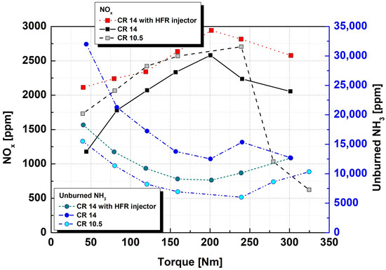 The emission results for NOx and unburned NH3 according to the changes in each combustion control variable and load are shown in Figure 10. As expected from the calculated in-cylinder temperature results shown in Figure 6, the NOx emissions increased owing to the increased combustion temperature in all operating ranges. The combustion efficiency improved with the application of HFR injectors, and unburned NH3 decreased compared to the case of applying existing injectors but was still higher than that in the lower-compression-ratio condition. With the application of the HFR injector, the evaporation of the injected fuel and its mixing with air improved under high-compression-ratio conditions; however, the result appears to be unable to overcome the increase in fuel droplets that failed to evaporate on the upper surface of the piston, which increased compared to the low-compression-ratio condition. The highest value occurred under the lowest load condition of 40 Nm and decreased as the load increased; however, under high-load operation conditions of 200 Nm or more, the combustion efficiency decreased and tended to increase again. Combustion stability was secured under high-load operating conditions; however, this is believed to be due to the deterioration of combustion efficiency owing to the large absolute amount of fuel input. Regardless of the injector type, the decrease in combustion efficiency under high-load operating conditions of 240 Nm or more affected the combustion temperature, resulting in a tradeoff trend in which NOx emissions decreased.