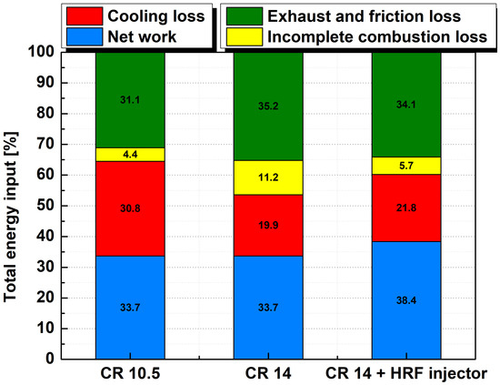 To analyze how the effects of changes in control variables, such as compression ratio and HFR injector changes, were distributed under each condition, the cooling loss, incomplete combustion loss, and exhaust and friction were compared with the total input energy based on the amount of fuel supplied under the existing compression ratio condition in Figure 11 under the condition with an increased compression ratio and the condition using an HFR injector. The incomplete combustion loss is calculated from the measured unburned NH3 mass, and the remaining unused energy comprises the exhaust and fraction losses. Compared to the existing compression ratio condition, the incomplete combustion loss due to unburned NH3 increased significantly with an increased compression ratio. It is believed that the increase in friction caused by the geometric change of the pistons owing to the increase in the compression ratio affected the exhaust and friction losses. As the combustion temperature decreased, the cooling loss decreased significantly; however, the actual net work was similar. When HFR injectors were applied with an increase in the compression ratio, the combustion temperature increased, and the cooling loss slightly increased compared to the high-compression-ratio condition without HFR injectors. The proportion of net work for a selected engine operating condition increased by 4.7% as incomplete combustion and exhaust losses were reduced by reducing the unburned NH3.