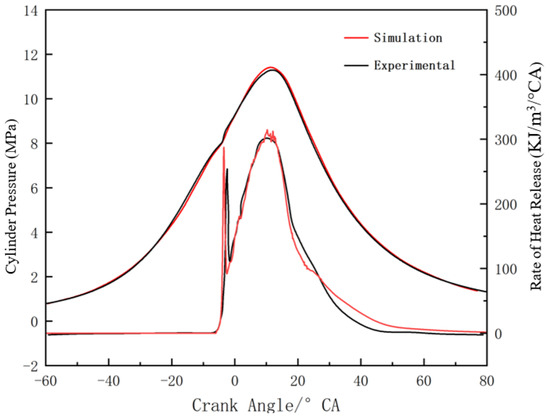 Figure 2 shows a comparison between experimental and simulated cylinder pressure and heat-release rate. It can be seen from the graph that the curves of the experiment and simulation are quite consistent. The peak pressure of the experimental cylinder is 11.5 MPa, and the peak pressure of the simulated cylinder is 11.3 MPa. The authors of this paper believe that the model can predict the combustion and emission effects of the diesel engine well by comparing the curves of cylinder pressure and heat-release rate.
