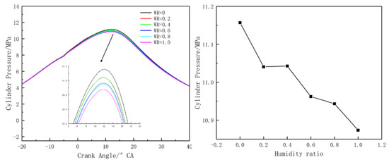- The humidity ratio can affect fuel pyrolysis and consequently cylinder pressure by changing the oxygen concentration and water molecule decomposition radicals. When WR = 1, the cylinder pressure decreases by 2.61% compared to when WR = 0. When the oxygen concentration increases from 21% to 27%, the peak cylinder pressure increases by 8.3%;