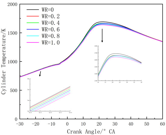 Figure 4 shows the relationship between cylinder temperature and crankshaft angle under different humidity ratios. It can be seen that air humidification can reduce the cylinder temperature. For the compression stage, because of the relatively large specific heat capacity of water, the cylinder temperature decreases with an increase in humidity ratio. After entering the cylinder, it is distributed in areas such as the cylinder wall, piston, and gap, which can absorb more heat. For the combustion stage, the peak temperature of a cylinder with a humidity ratio of 0.2 is lower than the peak pressure of a cylinder with a humidity ratio of 0.4. This is because at lower humidity ratios, functional groups generated by water molecule decomposition can promote fuel pyrolysis, leading to an increase in cylinder temperature. The peak cylinder temperature at a humidity ratio of 0.6 is lower than the peak at a cylinder temperature of 0.4, and the crankshaft angle reaching the peak is delayed. This is because water molecules need to absorb more heat during the decomposition process than when the humidity ratio is 0.4. At the same time, more water molecules will reduce the oxygen concentration in the cylinder, reduce the rate of fuel pyrolysis reaction, and reduce the temperature inside the cylinder.