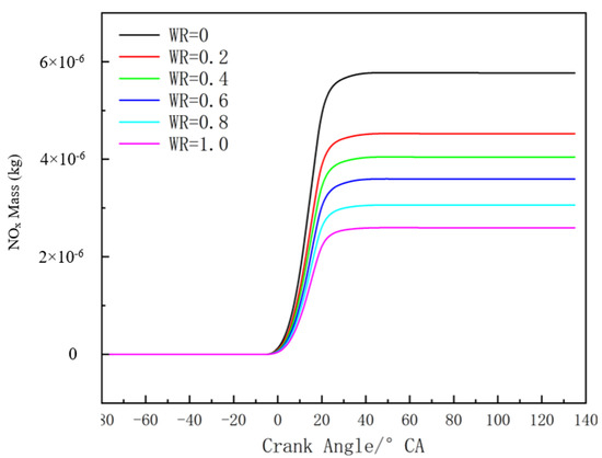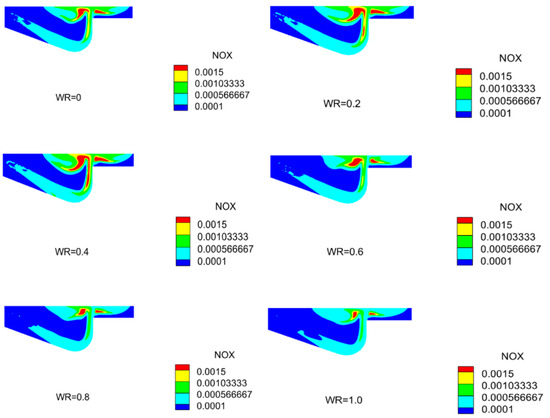 NOx distribution in the cylinder at CA50 ATDC under different WRs.