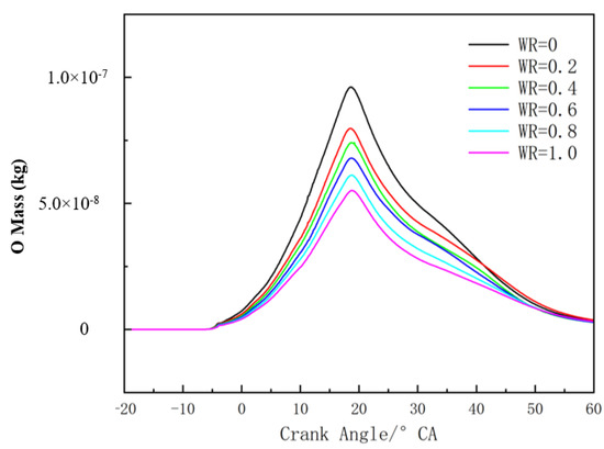 Figure 5 shows the relationship between NOx and crankshaft angle. It can be seen that intake humidification can effectively decrease NOx emissions. As the humidity ratio increases, the rate of NOx generation also decreases, and the peak emissions also decrease. The NOx emissions at a humidity ratio of 1.0 are 55.02% lower than those at a humidity ratio of 0. The rate of NOx generation mainly depends on the average temperature inside the cylinder and the concentrations of O and N2 [36]. Figure 6 presents the relationship between the mass of O radicals and the crankshaft angle at different humidity ratios. From the graph, it can be seen that as the humidity ratio increases, the number of oxygen radicals decreases. When the humidity ratio is 1.0, there are the fewest oxygen radicals, and the least NOx is generated. Figure 7 is a schematic diagram of NOx emissions during fuel combustion at 50% under different humidity ratios (CA50). From the graph, it can be seen that the generation of NOx is mainly concentrated in areas such as cylinder walls, cylinder heads, and clearances, and as the humidity ratio increases, the area of NOx generation decreases.