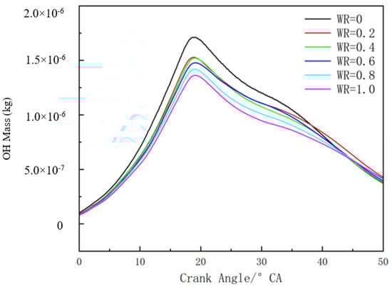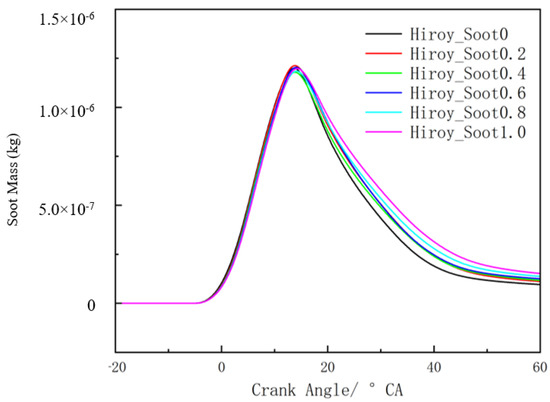 The formation of soot particles is due to incomplete combustion of fuel. This means that higher carbon emissions are a sign of inadequate combustion. The process of forming cigarette ash particles includes the formation of cigarette ash precursors; nucleation or initial particle formation of heavy polycyclic aromatic hydrocarbon molecules; increase in particle mass from addition of gas-phase molecules; coagulation caused by reactive particle collision; carbonization of granular materials; and oxidation of polycyclic aromatic hydrocarbons and smoke particles [37]. Figure 8 shows the variation in OH radicals with crankshaft angles of different humidity ratios. As the humidity ratio increases, the quality of OH-radical generation decreases. This is mainly due to the increase in humidity ratio leading to a decrease in cylinder temperature, a decrease in the decomposition reaction rate of water molecules, and a decrease in the quality of OH-radical generation. Figure 9 illustrates how the emissions of soot and dust vary with crank angles (CAs) under different humidity ratios. Figure 10 presents the soot distribution at CA50. Theoretically, as the humidity ratio increases, the ignition-delay period becomes longer, allowing for more uniform fuel and air mixing. This extended mixing time ensures better homogeneity, while intake humidification also mitigates localized oxygen deficiency and fuel-rich regions. One primary effect of intake humidification is to lower the combustion temperature within the cylinder, which helps to inhibit fuel pyrolysis and reduce soot formation. Moreover, water molecules decompose into OH radicals at high temperatures, accelerating soot oxidation and consequently reducing soot levels. As the humidity ratio rises from 0% to 100%, there is a slight reduction in soot content.