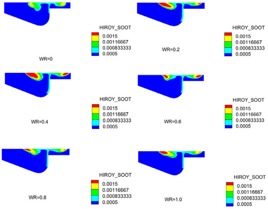 Soot distribution in the cylinder at 50° CA ATDC under different WRs.